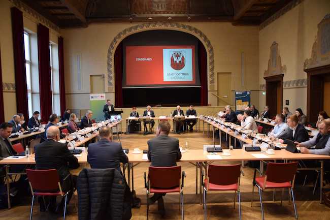 Zum Auftakt wurden in der Industrie- und Handelskammer Cottbus die strategischen Rahmenbedingungen des Strukturwandels besprochen. Themen waren unter anderem die deutsch-polnische Wirtschaftskooperation sowie die Bedeutung grenzüberschreitender Strukturen wie der Euroregion Spree-Neiße-Bober.